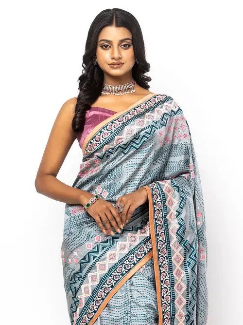 Grey Printed and Embroidered Silk Saree