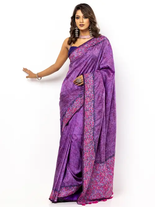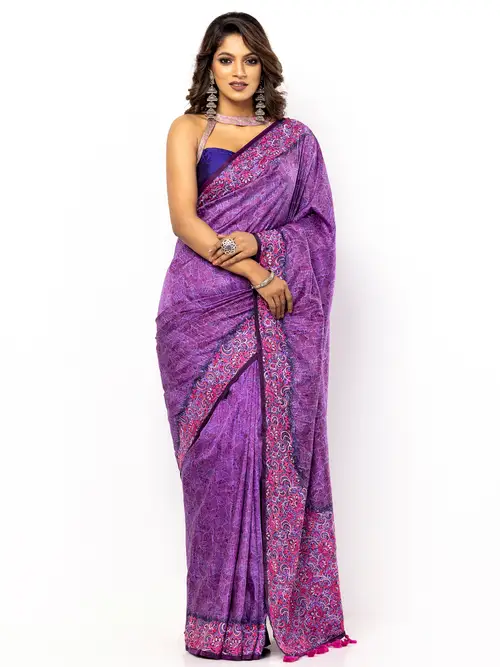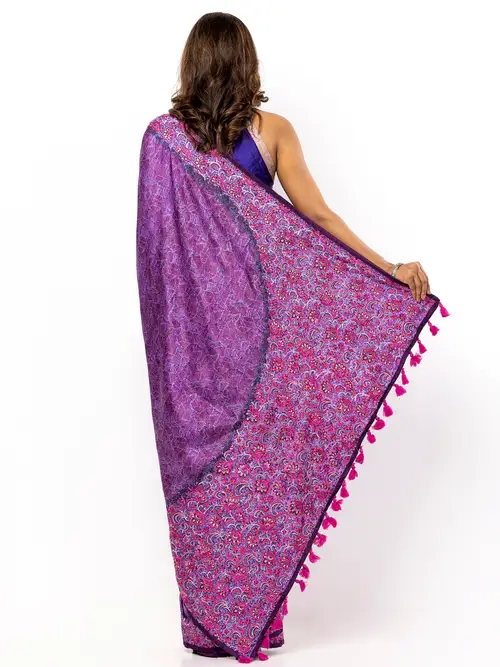 Mauve silk saree with multicolour all over embroidery. Comes with matching unstitched blouse piece. Blouse shown in the photo is a styling suggestion, it is not a part of the actual product.