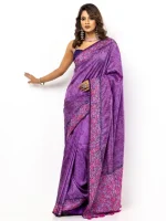 Lavender printed silk saree with brush painted details. Comes with matching unstitched blouse piece. Blouse shown in the photo is a styling suggestion, it is not a part of the actual product.